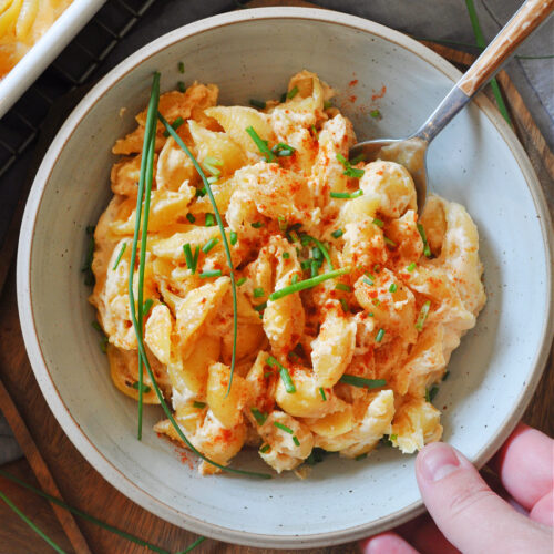 This no-boil macaroni and cheese is insanely cheesy and creamy. I think it’s the perfect dish to bring to a cookout or a holiday meal with family or friends. It takes no time at all, plus it reheats really well. I love putting different toppings on the mac and cheese, like bread crumbs or crushed potato chips. This will be everyone’s favorite macaroni and cheese and they will be so shocked when you tell them this is a dump-and-bake, recipe. They will also be shocked by how few ingredients this takes, and there is no need to make a roux to thicken the sauce.